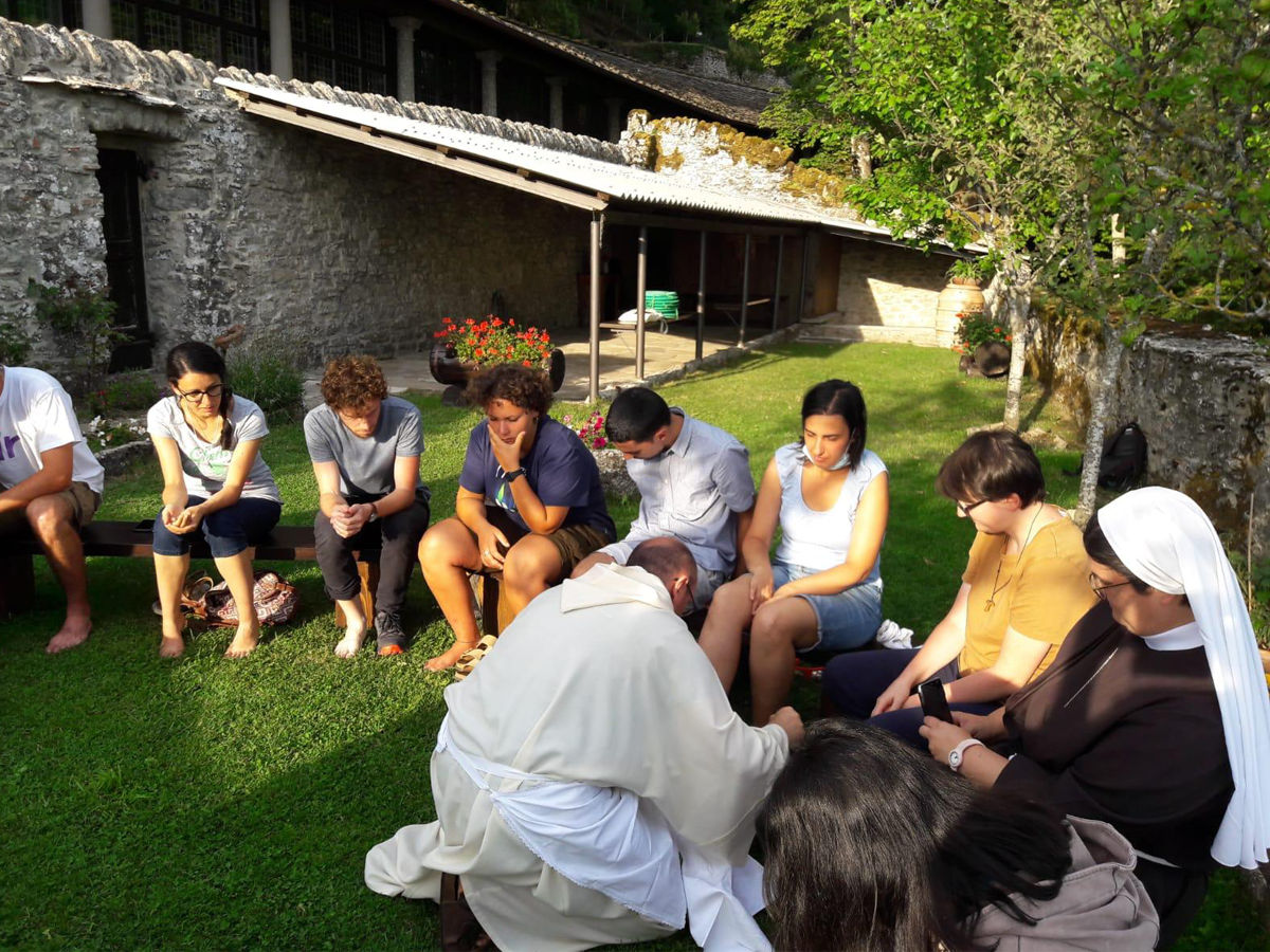 Questo viaggio attraverso le grandi domande è iniziato in compagnia di Giobbe, che dialogando con Dio è riuscito ad andare oltre la sua visione semplicistica di un Creatore-padrone che interviene di tanto in tanto per premiare i buoni e punire i cattivi. Spesso, infatti, come hanno sottolineato fra Alessio, fra Lorenzo, suor Valeria e suor Tiziana, noi non abbiamo problemi con Dio, ma con l’immagine distorta di Dio che ci siamo costruiti, frutto dei nostri idoli. Così arriviamo a definire Dio, e per giunta a definirlo in modo sbagliato. Giobbe vive una crisi profonda che sembra una maledizione e invece è una Grazia: allo stesso modo, anche nelle nostre vite Dio bussa con insistenza al nostro cuore per suscitare la nostalgia di un vero incontro. Altre volte invece Dio tace perché solo nel “deserto” vengono distrutti gli idoli di cui ci circondiamo: vitelli d’oro che luccicano al sole ma che non illuminano la nostra vita. Tanto per iniziare, spesso noi pensiamo che Dio ci chieda qualcosa, invece accade proprio il contrario: Lui dona con generosità e ci consegna un invito perché sogna qualcosa di bello e di grande per la nostra vita. Se accogliamo questo invito, puntualmente Dio dona cento volte di più. San Francesco è stato un altro importante compagno di viaggio durante il corso vocazionale, perché ci ha mostrato che Dio non lascia i nostri desideri in balìa degli avari criteri del mondo, ma li dilata secondo la sua Grazia e bellezza. Ogni desiderio, abbiamo imparato, contiene in sé un soffio divino, e non va mai ignorato. Così san Francesco si è ritrovato a vivere un progetto ancora più grande del suo, umano e limitato, dove il desiderio di grandezza si è trasformato nella donazione senza riserve della santità. L’ultima compagna di viaggio è stata Maria, che si è lasciata incontrare dal desiderio divino e che ci insegna che la storia si fa con i “sì” e non con i “se”. Non solo: la sua vita ci ha mostrato che Dio non entra nella nostra vita con i ragionamenti ma con i fatti concreti di ogni giorno, dove ci visita con un saluto pieno di gioia: “Rallegrati!”. A questo punto, il viaggio del corso vocazionale ci ha portato ancora più lontano attraverso il bibliodramma, grazie al quale abbiamo rivissuto il passo dell’unzione di Betania, in cui la peccatrice bagna di lacrime e cosparge di profumo i piedi di Gesù. È stato un momento prezioso perché abbiamo fatto esperienza del Vangelo in prima persona, con tutto il nostro corpo. Come dire: quando si sta alla presenza di Dio cadono anche le armature fatte di parole e rimangono i desideri più profondi nella loro verità, perché il corpo non può mentire. Abbiamo fatto esperienza concreta dell’amore di Gesù anche attraverso la lavanda dei piedi, dove siamo stati toccati dalla Grazia nei nostri errori e nelle nostre imperfezioni, amati senza limiti e senza riserve. Allora abbiamo capito che il Vangelo non è una bella teoria, ma l’Incontro con un Dio “che ci ama di amore eterno” e che ci visita dove non ci saremmo mai aspettati: non nella testa, ma nei piedi. Questo amore “scomodo” e rivoluzionario ci mette di fronte a un’altra domanda: ci lasciamo lavare i piedi da Gesù, cioè ci lasciamo amare da Dio, e siamo in grado di lavare i piedi dei nostri fratelli? Alla fine del corso vocazionale forse non abbiamo trovato risposte, ma nuove domande che mettono in cammino. Proprio come Giobbe, non possiamo dire di aver trovato risposte su Dio ma possiamo dire di averlo incontrato. Cinzia